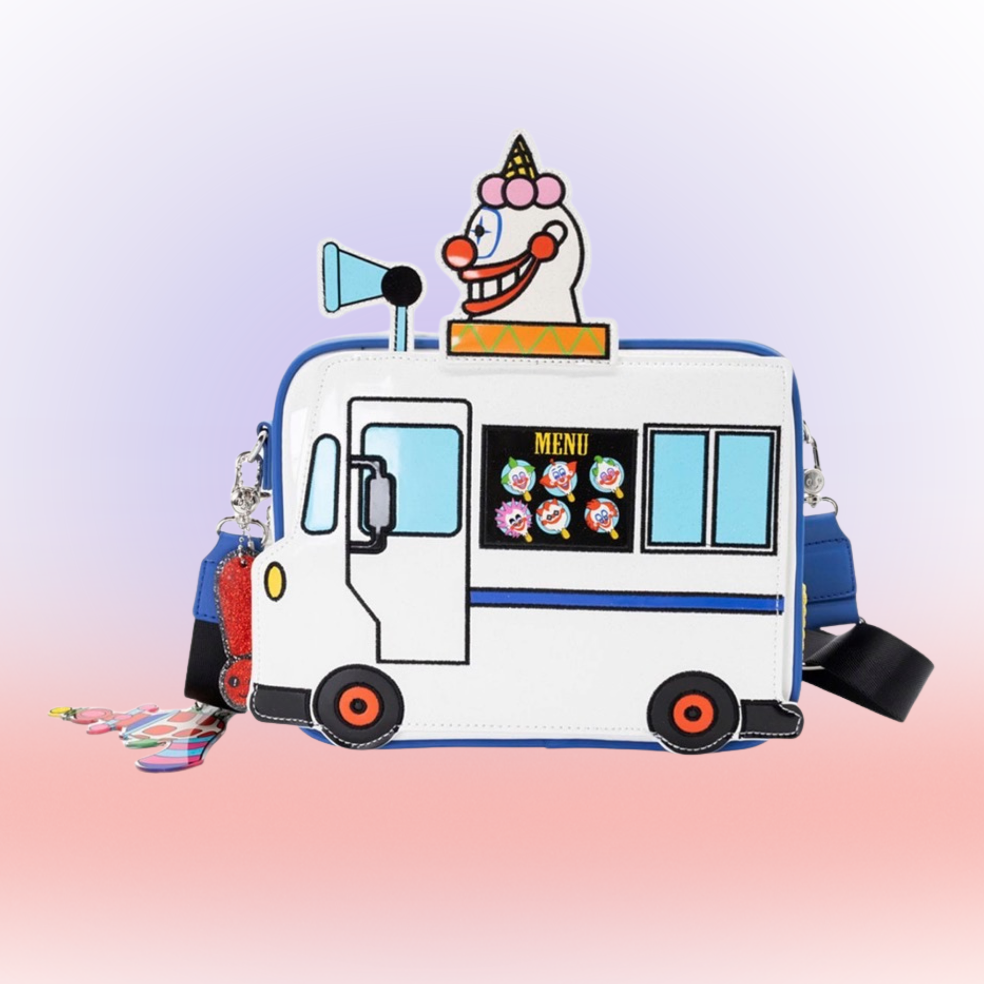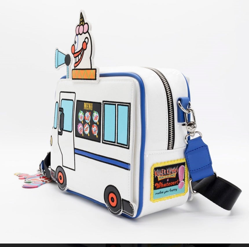 Scoop up some cosmic chaos with this Killer Klowns From Outer Space crossbody bag inspired by Jojo's iconic ice cream truck. Featuring a large acrylic ray gun charm and removable strap with side D-rings for securing your favorite trinkets, this bag blends creepy-cool style with practical storage. The interior showcases exclusive Whatever! Makes You Happy popsicle artwork custom-redrawn by WHMH artists, while the exterior displays frosty, one-of-a-kind designs you won't find anywhere else. Approximately 9 inches, it's the perfect companion for fans who want their accessories as delightfully twisted as the film itself.